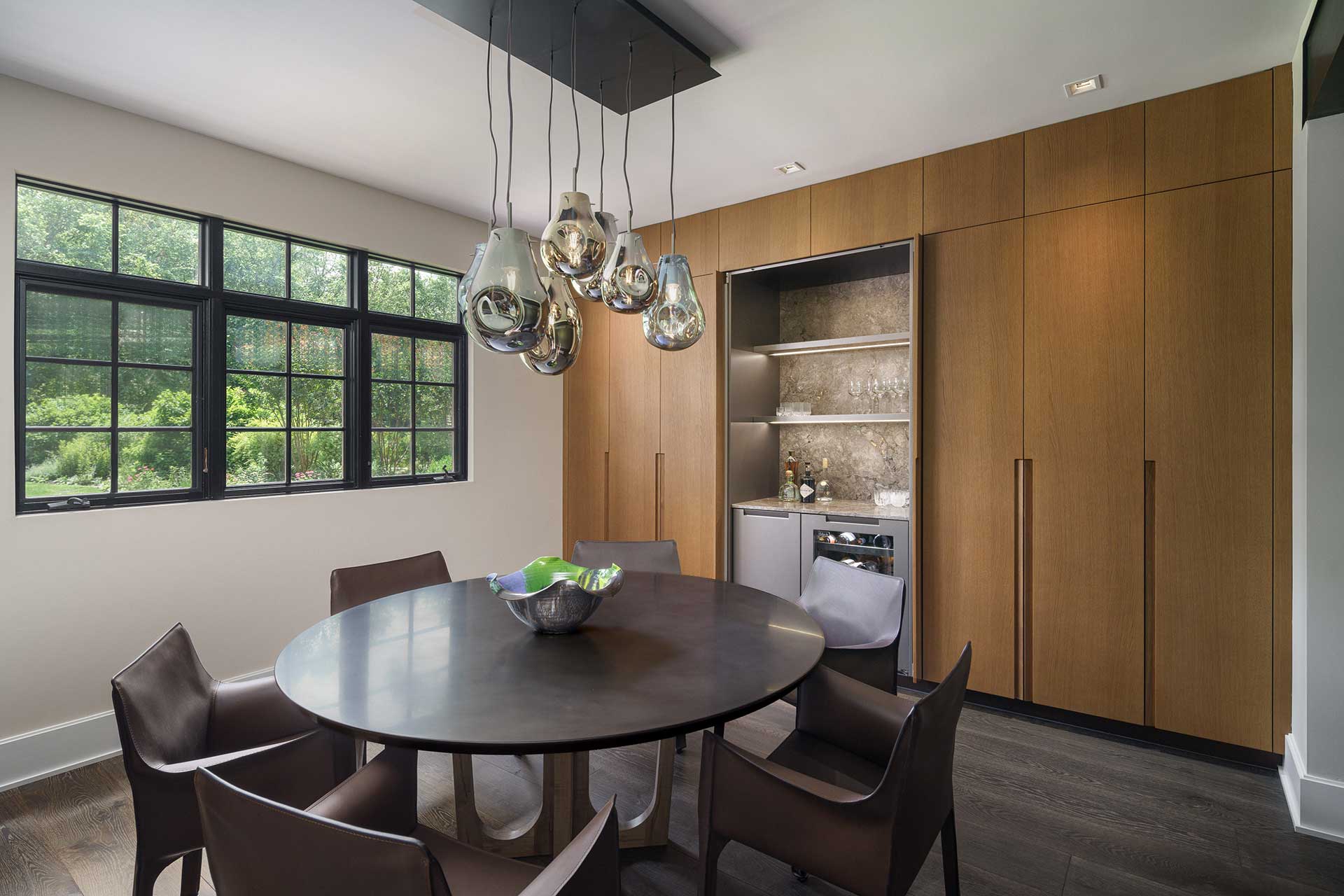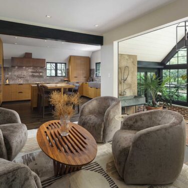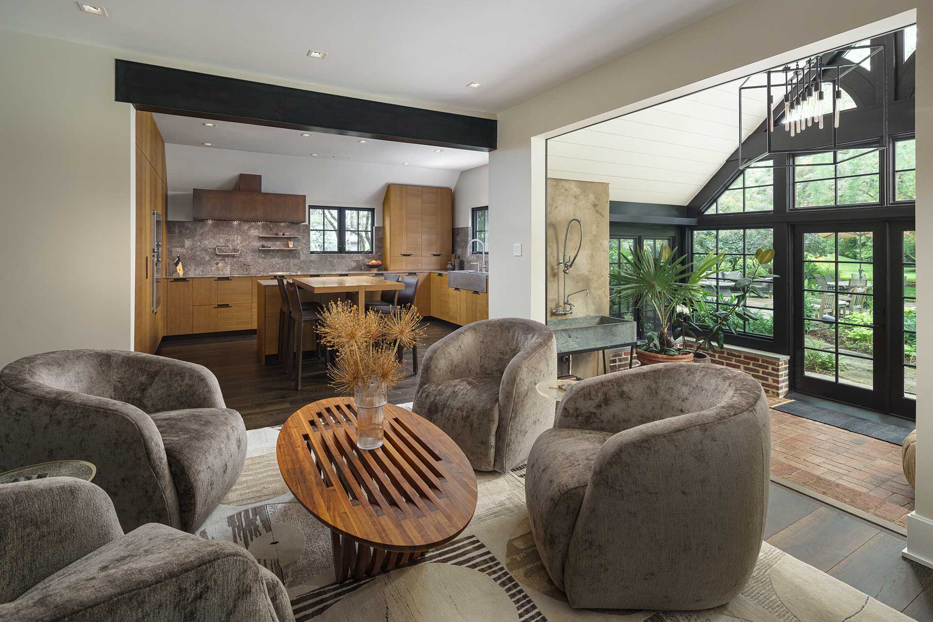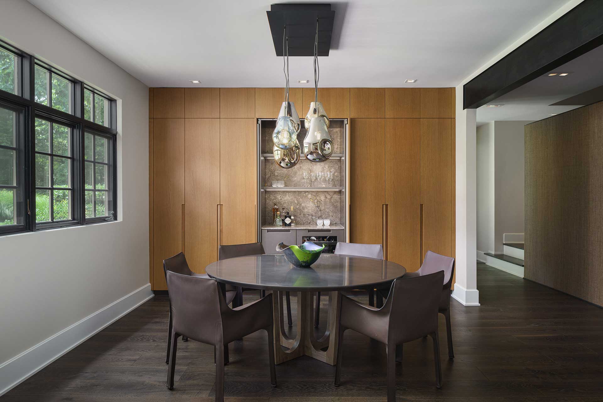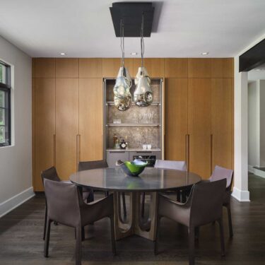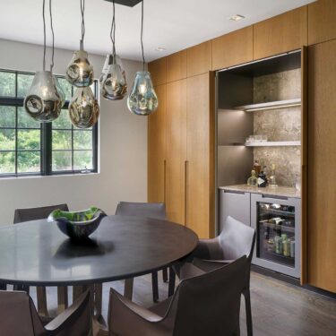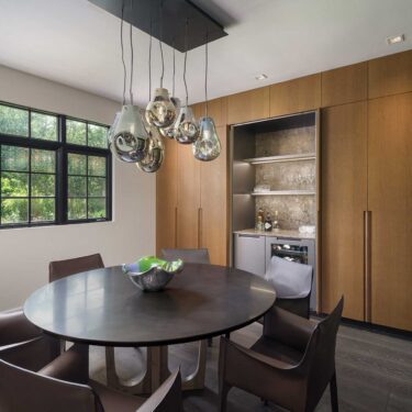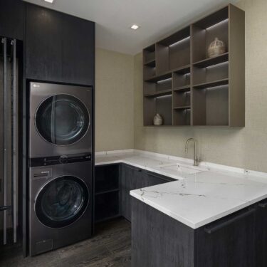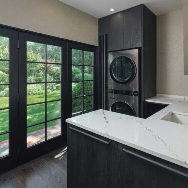 The cabinetry’s presence extends beyond the kitchen, seamlessly integrating into the dining room, laundry room, and primary bath. This continuity of materials and design fosters a sense of harmony, flow, and understated elegance throughout the home.
