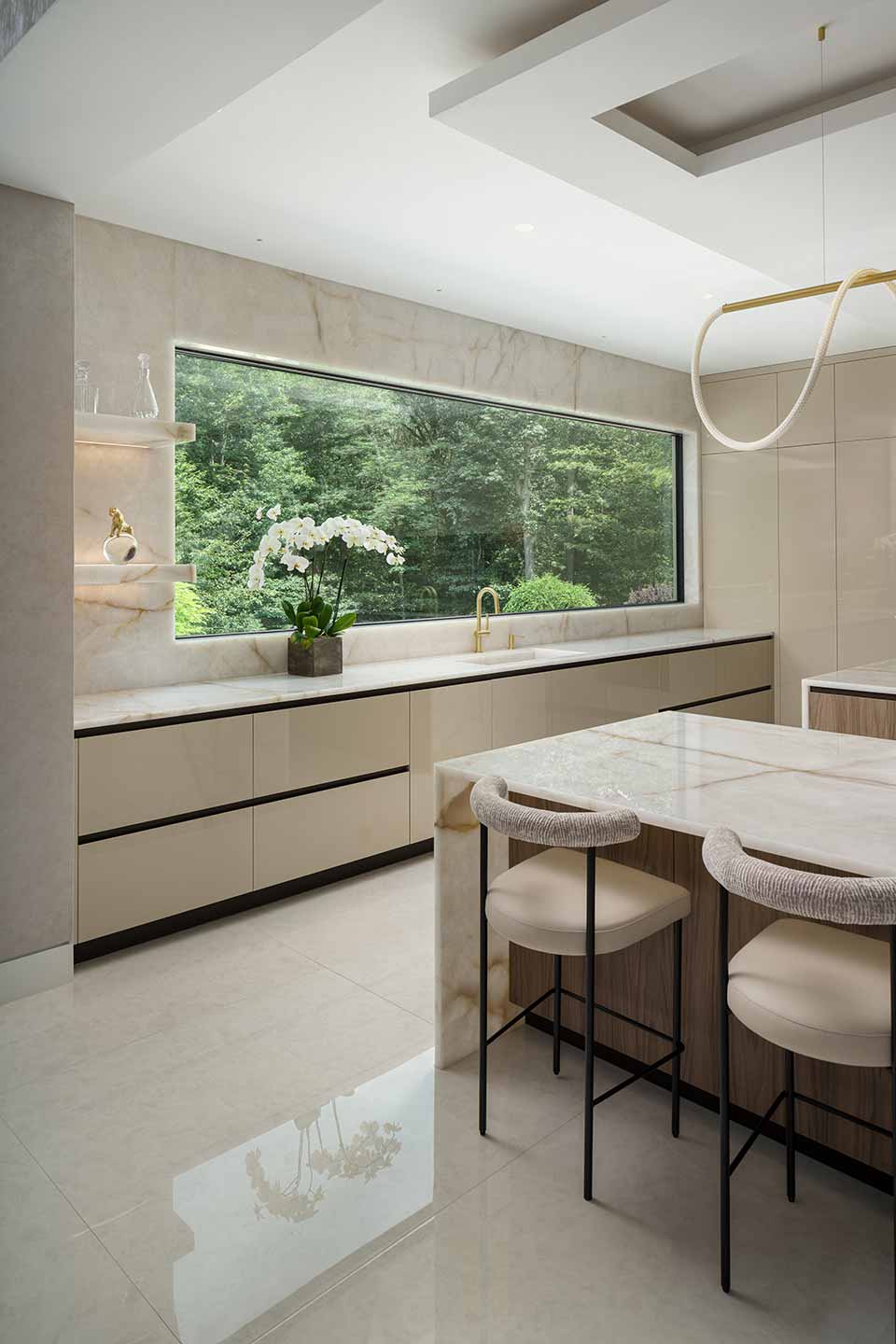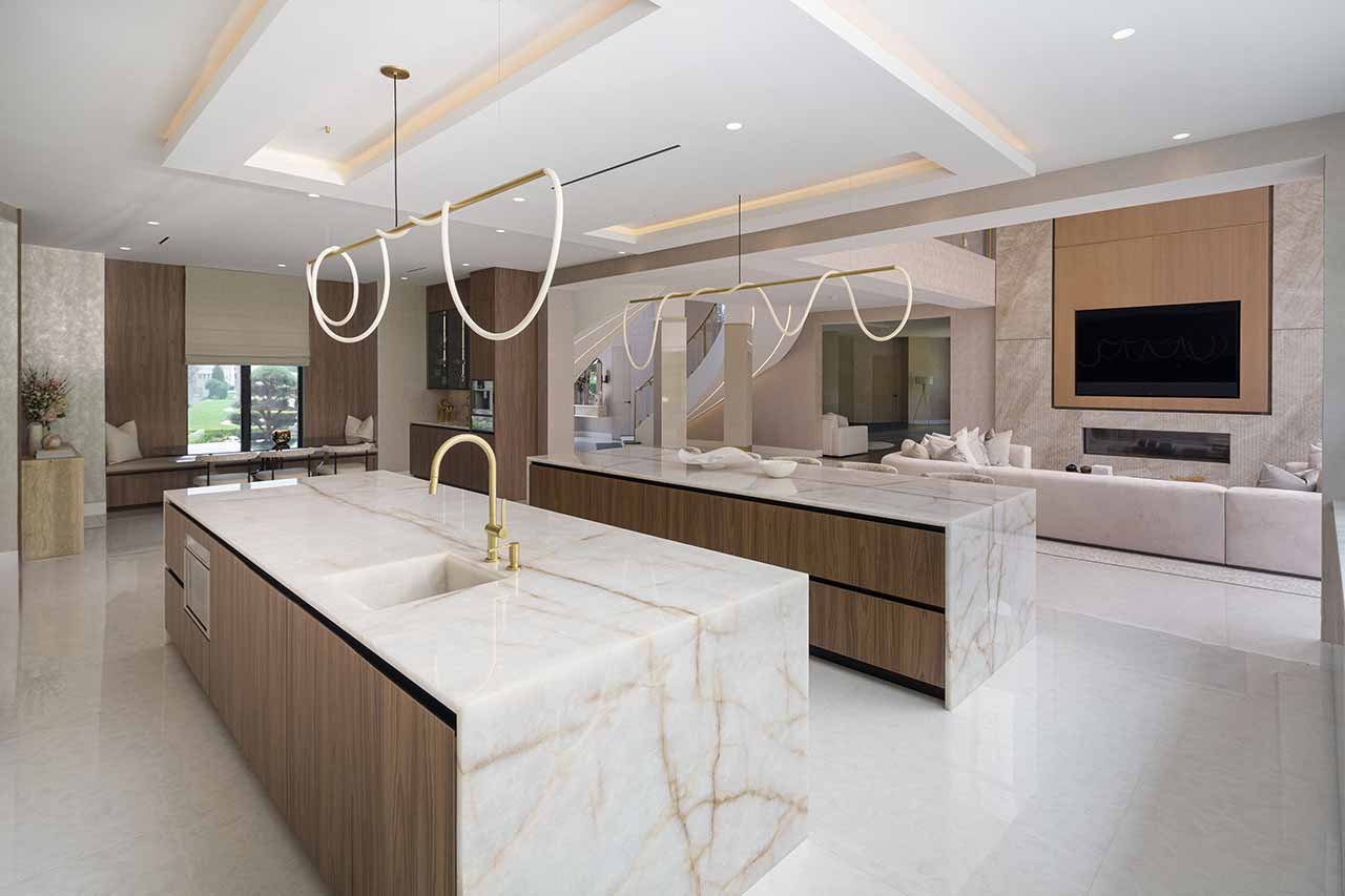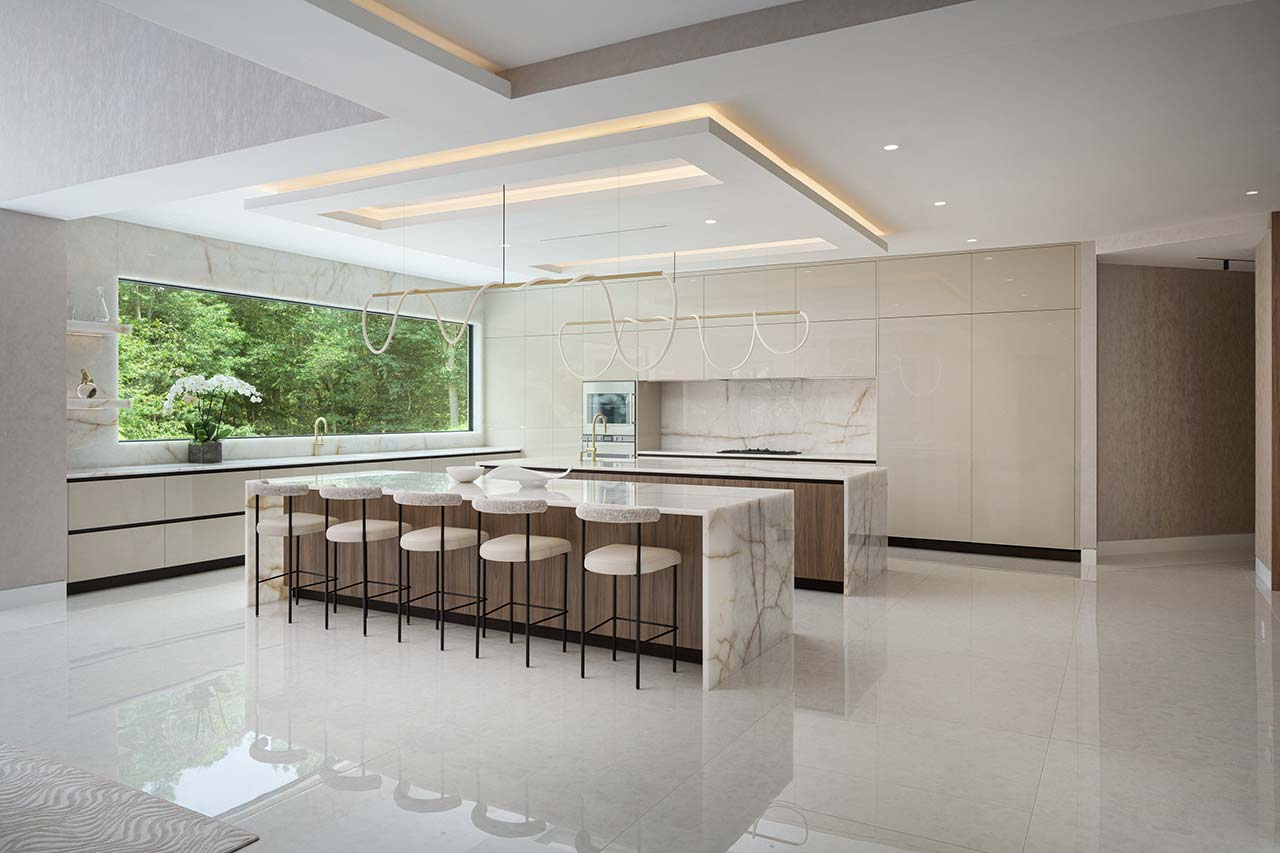 Two dramatic islands in Cristallo quartzite define the space, serving as both a striking focal point and a hub for cooking, dining, and entertaining. High-gloss lacquer cabinetry is paired with warm walnut laminate, balancing modern sophistication with natural depth. A breakfast area with a family table and a custom coffee bar adds comfort and versatility, while the open plan connects seamlessly to the family room with views of the landscaped gardens and pool.