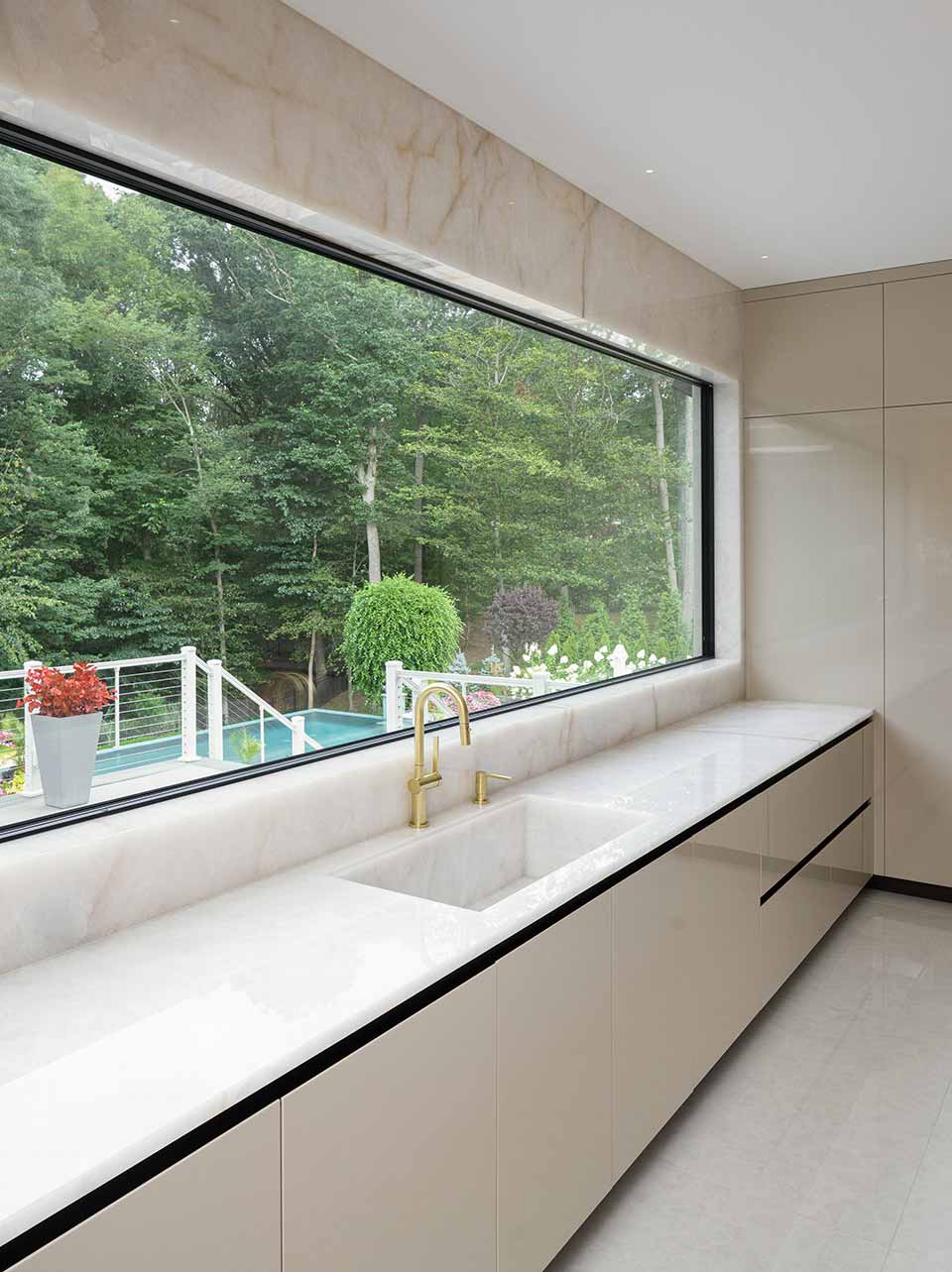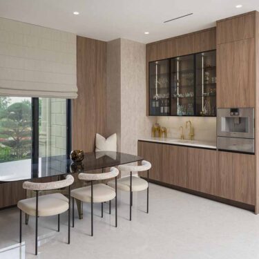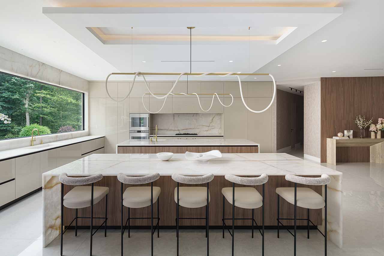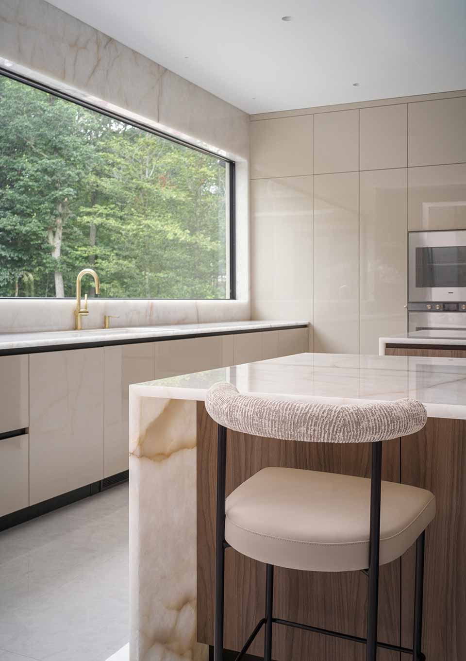 Two dramatic islands in Cristallo quartzite define the space, serving as both a striking focal point and a hub for cooking, dining, and entertaining. High-gloss lacquer cabinetry is paired with warm walnut laminate, balancing modern sophistication with natural depth. A breakfast area with a family table and a custom coffee bar adds comfort and versatility, while the open plan connects seamlessly to the family room with views of the landscaped gardens and pool.